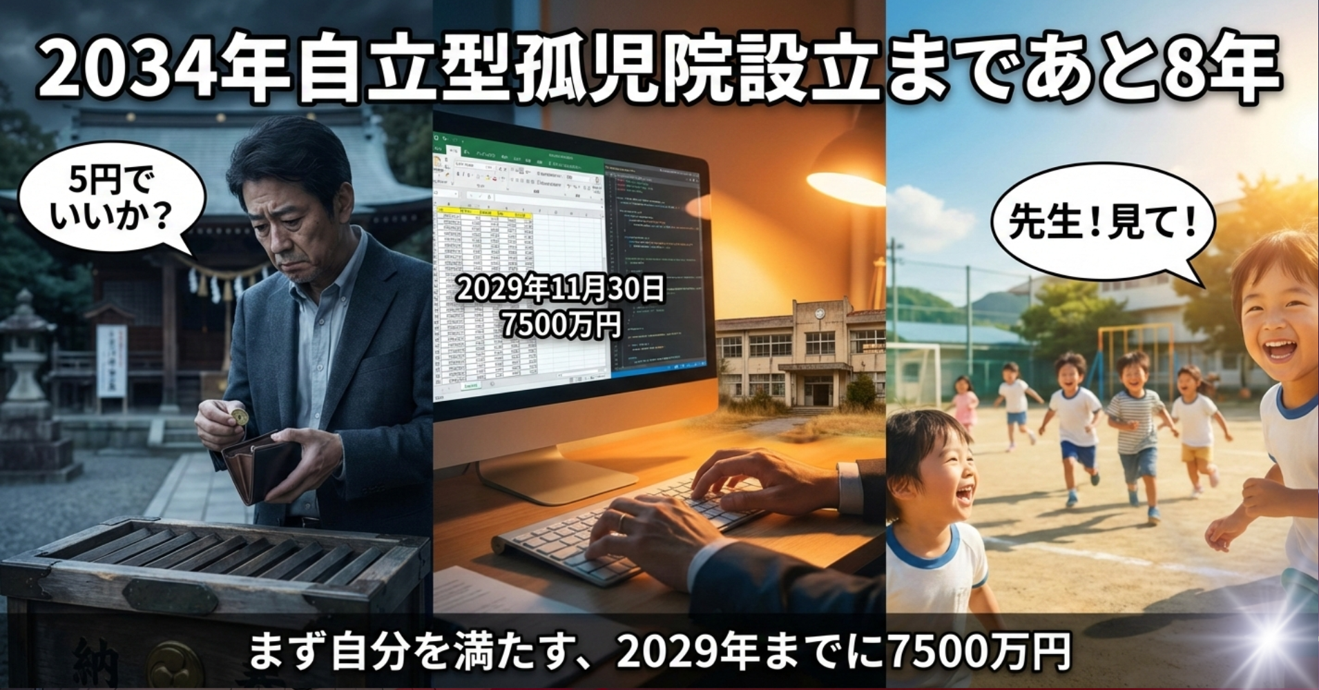 神社でお賽銭を入れるとき、俺はいつも躊躇する。「5円でいいか?」って。24時間テレビを見ると、寄付について考える。でも、今月の生活費が頭をよぎる。こんな俺が、2034年に自立型孤児院を設立すると決めた。望まれずに生まれてきた子供たちに、希望を与える。でも、その前にやることがある。まず、自分を満たす。2029年11月30日までに7500万円。配当で生活費が賄える金額。これは孤児院のためじゃない。完全に自分のためだ。