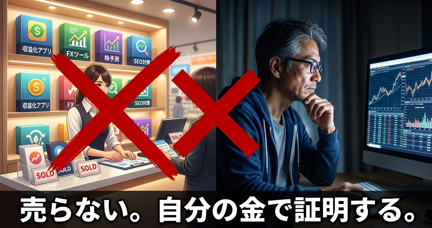 「月額課金にすれば?」「予想配信サービスにしたら?」。周りから何度も言われた。当たるアプリができたら売ればいい。それが普通の発想だし、ビジネスとしては正しい。でも俺は、売らないことに決めた。このアプリを自分で使って、自分の金を自分で転がして、運用益で生きていく。正気じゃないと思われるだろう。でも、この選択には、56年間生きてきた男の、譲れない理由がある。