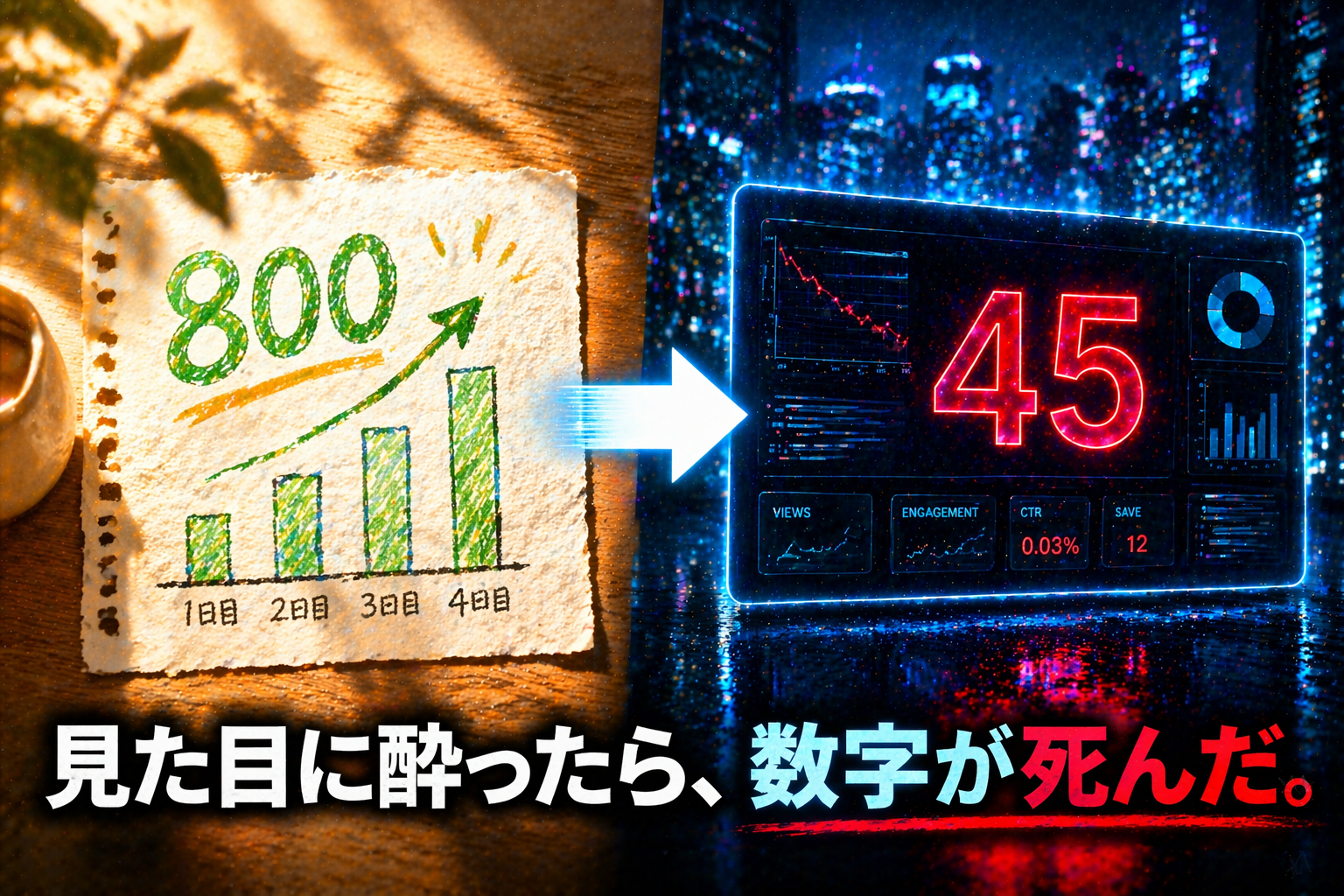 見た目を変えたら、数字が死んだ。Xのインプレッションが800から45に落ちた。24時間経っても戻らない。サイバーパンク調にリニューアルして「かっこいい」と自画自賛した翌日の出来事だ。慌ててAIに相談したら一言。「文章スタイルまで変えたのが原因です」。ハッとした。見た目にこだわって、本質を見失っていた。
